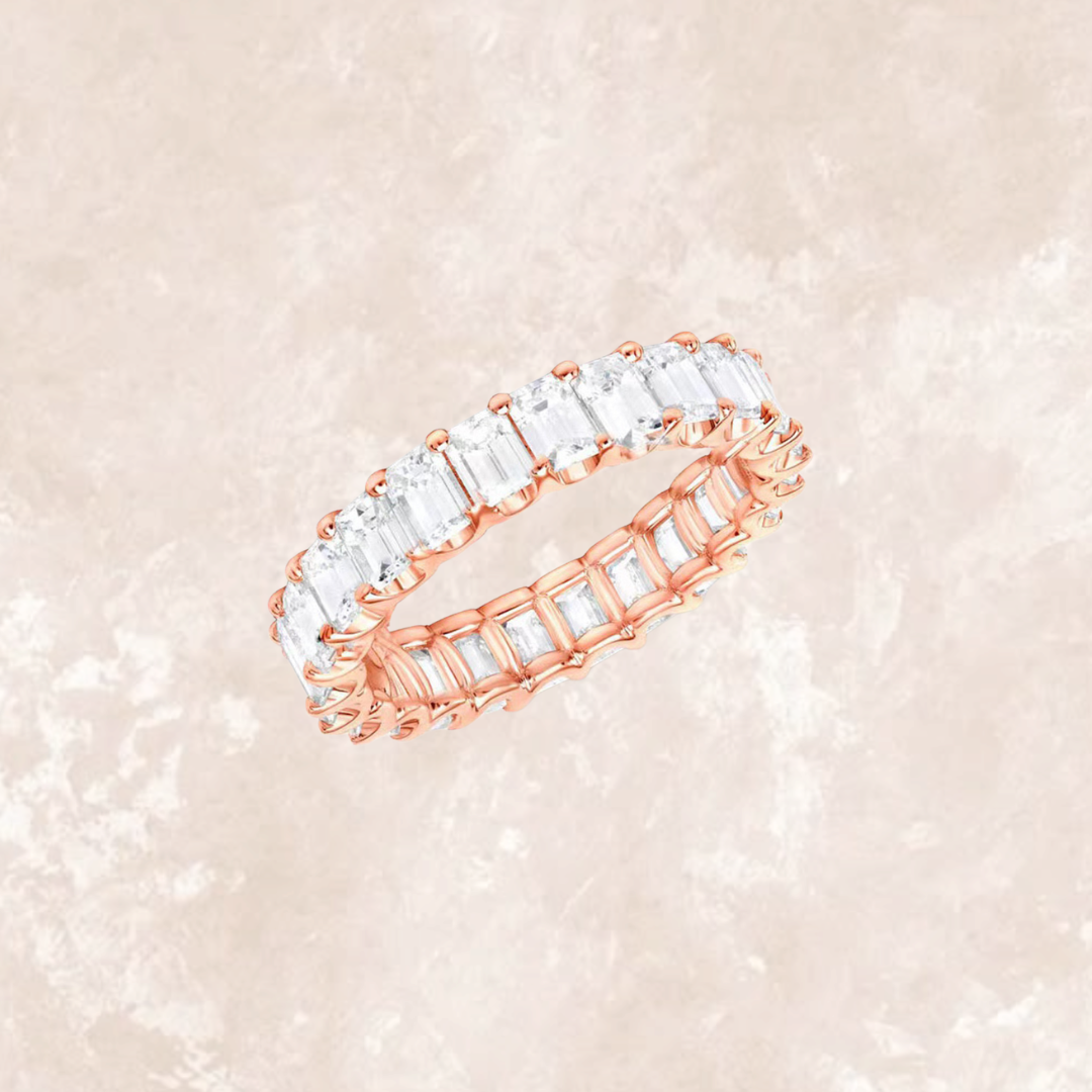 Radiant cut diamonds have about 70 facets, it had a high brilliance thus it looks shiny and sparkly. With the eternity design, symbolise never-ending love or never ending youth. Now in trending Rose Gold. Rose gold is often associated with style, elegance and affluence. Rose gold’s soft hue can also appear romantic, refined and composed.